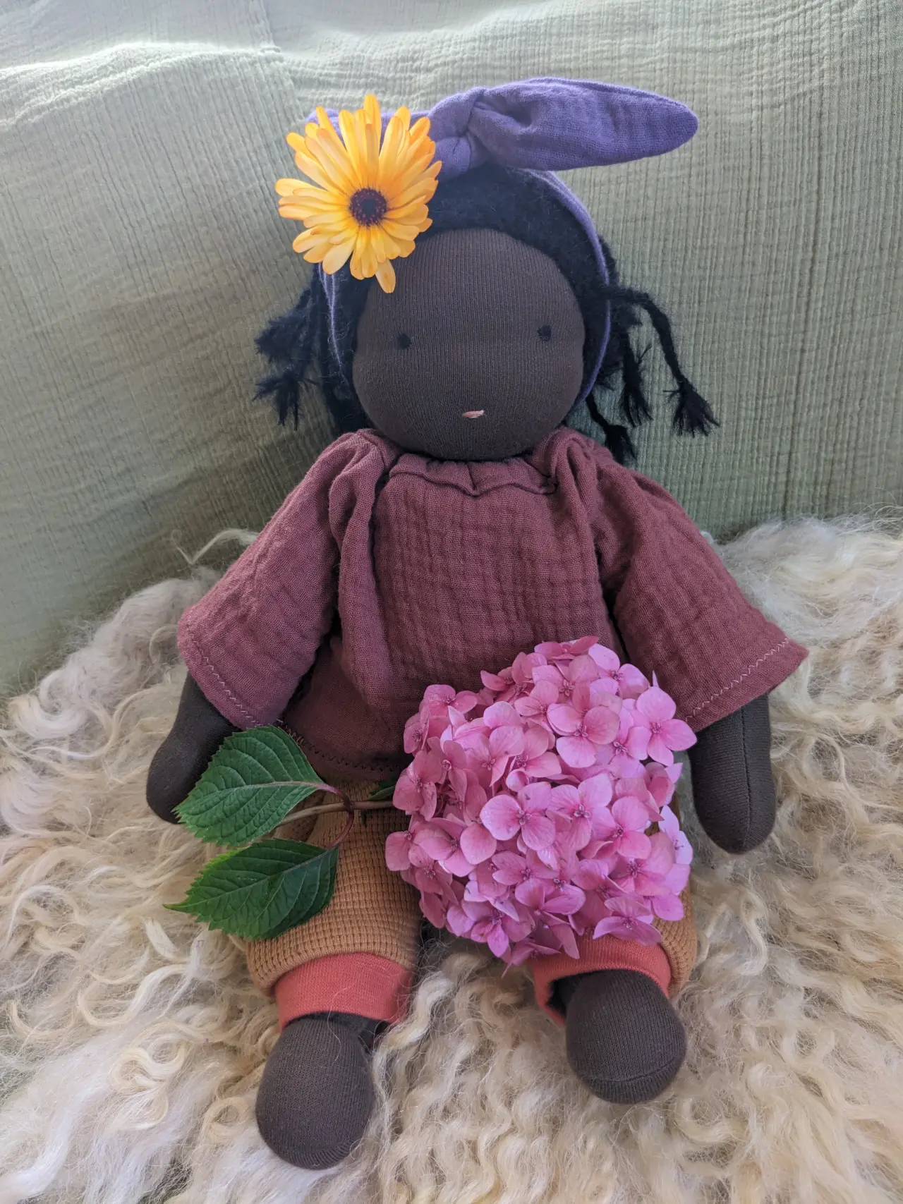 Wir arbeiten mit hochwertigen, nachhaltigen Materialien – Schweizer Puppentrikot, Bio-Schafswolle, Puppen-Mohair-Garn, …